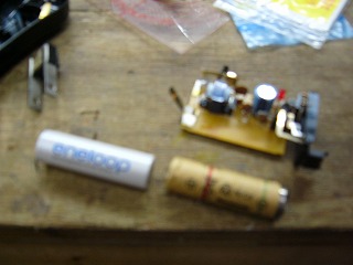 タブ付の 単三 Ni-MH を使えば、溶接機は不要ですね。溶接作業は、電池の電極上にニッケル板を置き、ニッケル板の上からペン型の電極を2本あてて、トリガーすれば一瞬のうちに完了します。(フットスイッチを使用) |