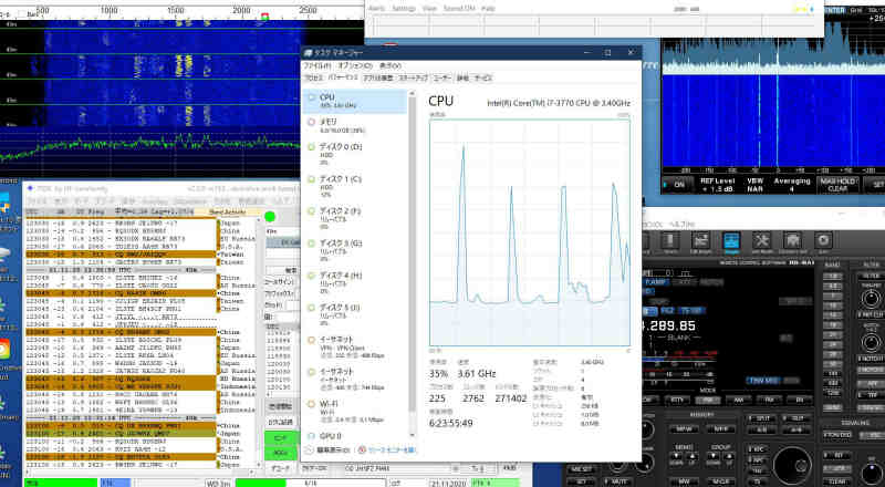 リモート運用時のクライアント側PCの要件について リモート運用時のクライアント側PCとして、どのくらいの能力がありばよいのか、私の使用環境を紹介します。使用しているWin10 PCは、Core i7 3.4GHz 16GB RAM Radeon HD 7770 GHz Edition で、ローカルUSB接続のIC-7600でFT8 JTDX運用とリモートVPN接続がIC-9700はDS-BA1 Remote Control運用 を同時に動作させていて、写真のようにCPU負荷35%で余裕のある状態です。しかもJTDXはSWLモード、さらにこのPCはインターネット経由でiPadやMacBookAirから操作できる状態になっています。Core i7でこの状態ですので、こんな使い方だと確かに Celeron では厳しいでしょうね。