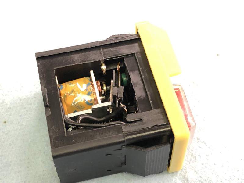 ベルトサンダーのスイッチが壊れました。10年以上使用していて写真の黄色いプラスチック部品が割れてボタンが飛び出しました。このスイッチはインターロック式PBスイッチで中にリレーが入っています。緑のONボタンを押し下げるとボタンが直接リレーの接点を押して回路が繋がり自己保持されます。定格250Vの品しか見つからずそれを購入したのですが、リレーはON状態を保持するだけなので100Vでも問題なく使用できました。リレーはしっかり2回路です。 詳細記事はこちらにあります。