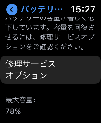 AppleCareが切れる前に、丸の内のストアでAppleWatchのバッテリー交換をしてきました。AppleCareに入っているから何時でも無料でバッテリー交換ができるわけではありません。”バッテリーの状態”で ”最大容量”が80%未満であるのが条件になるようです。このほか店頭の外見チェックで問題がないのを確認してからの工場送りになり、自宅に配送されるまで5日ほどかかりました。以前はその場で新品交換だったような、、、実は以前に80%をなかなか割らず、AppleCareが切れてしまったことがありました。今回は80%になった後、バッテリーを多く消費するワークアウトやLED照明の点灯などと充電をくりかえして1週間ほどで目出度く?! 78% になりました。どういうわけか、79%という数字は今まで見たことがないのは何故でしょうか?