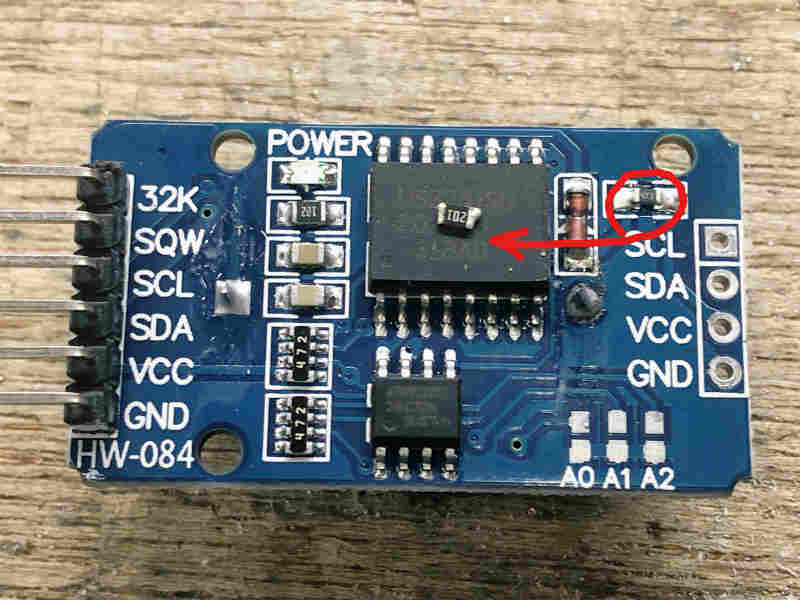 昨日の記事で使用している RTC DS3238 リアルタイムクロック で使っている2016リチウム電池が膨れてきました。本来ならば2032型の2次電池を使うのですが、手元になかったので短時間ならいいやという事でその辺にあった2016を突っ込んで開発をやっていたのですが、「あれ?ちょっと膨れてきたような・・・」というわけで外してみたらやはり(左側の電池)膨らんでいました。基板を見るとVCCから200Ωとダイオードを通して5Vがバッテリーに繋がっていました。うーん。 この電池で 200Ω じゃ膨らむよな~ (写真クリックで拡大して) 47kΩ(赤丸) に変えて、もうしばらく使います。
