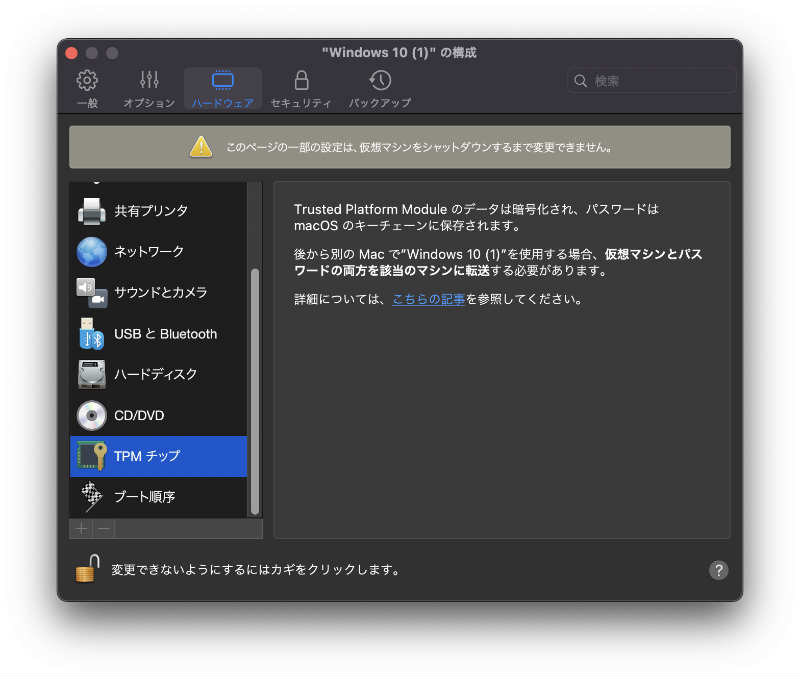 M1 MacBook Air の Parallels Desktop で動かしているWindowsがアップデートでWin11になったので、いろいろ見ていたら、設定に「TPMチップ」が表示されていました。