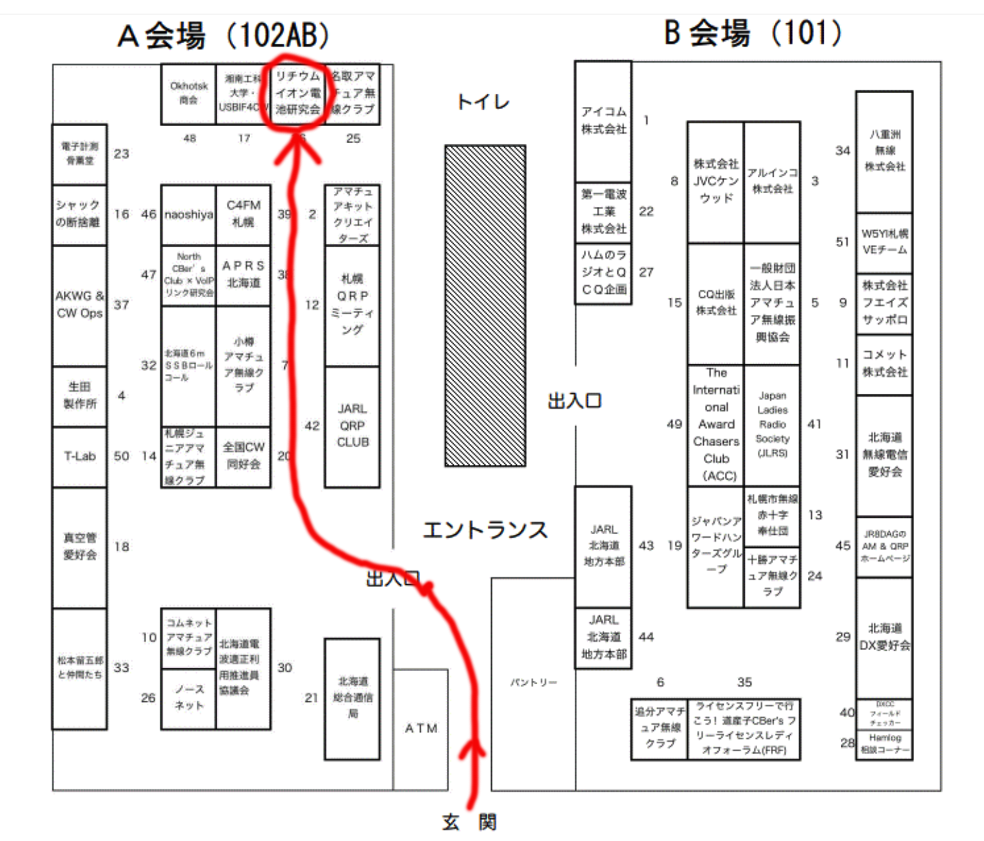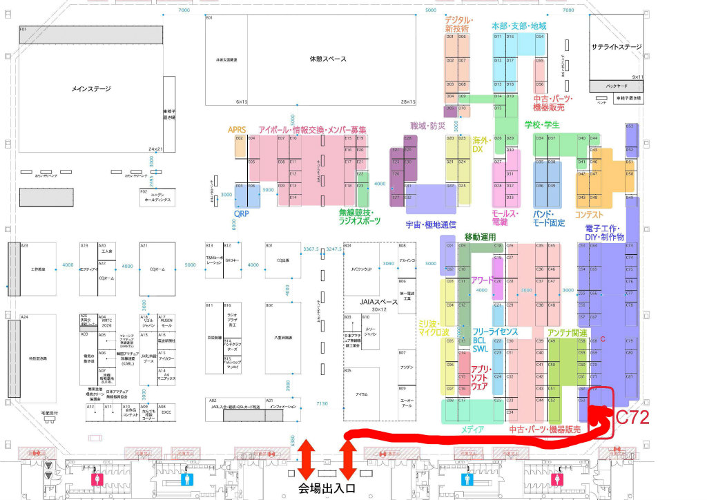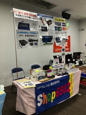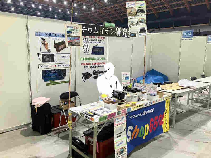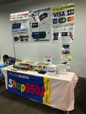 ハムフェア2025会場での出展位置をお知らせします。会場入り口からすぐ右へ真っすぐ進み、すみっこのC72番ブース「リチウムイオン電池研究会」Shop6502です。