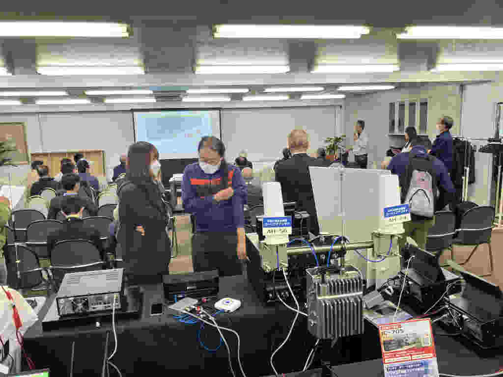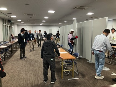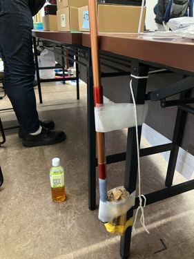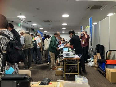 関ハム準備日当日、朝7時3分東京駅から新幹線で新大阪向け出発しました。新大阪からバスで伊丹空港近くのホテルにやってきました。ホテルからタクシーにて会場へ向かい、釣竿を立ててポスターを吊るし、机の周囲にフェンスと取り付けてディスプレイをほぼ完成させまし夕方から「関西自作の会」のミーティングにお邪魔させていただきました。