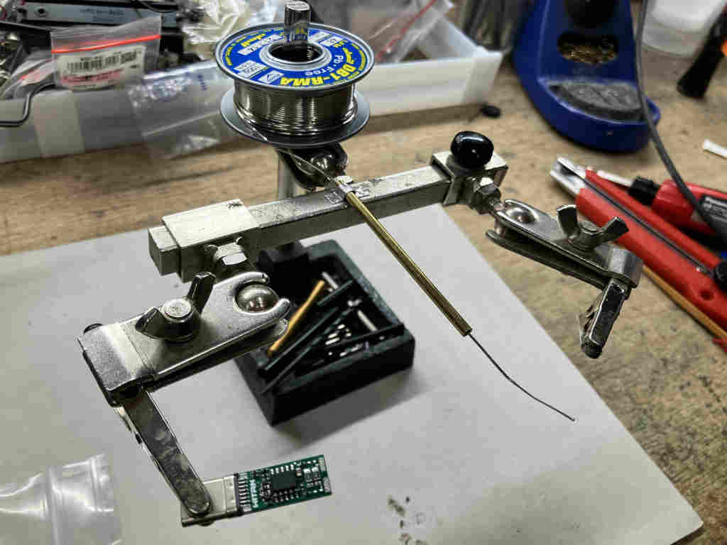 この製品の正式名称は忘れました。前回掲載時は半田リールをほぼ乗せただけでしたが、使いやすくするために、真鍮パイプで半田のガイドを付けました。