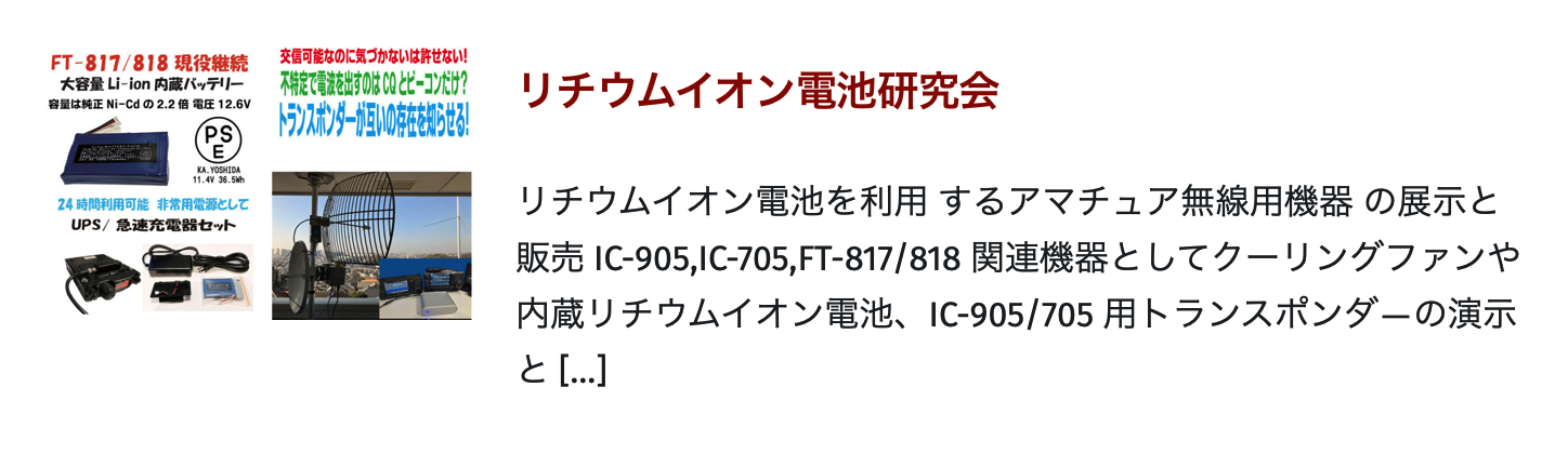 関ハムでFT-817/818のUPS電源装置とLi-ionバッテリーへの反応がすごくよかったのです。使用している日立マクセルが生産を中国工場へ移ったお話をしたところ、バッテリーを2台購入した人もいらっしゃいました。また、他の来場者の方からはオークションでFT-817(or 818)に十万円の値がついていたと聞きました。そういえば隣のブースに展示していたFTX-1Fをちょっと触ってみたのですが、、、これはFT-818の後継機じゃない! だから今、ノイズも少なく軽量なFT-817が再評価されているようです。